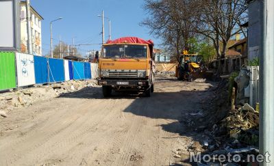 Районът, който предстои да бъде превърнат в площадно пространство с малка водна атракция, е оградена с метални пана, а вътре има техника, която работи по зоната.