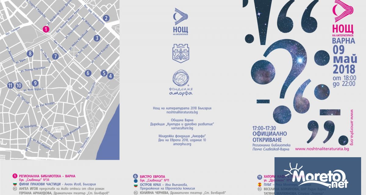 Тазгодишното издание на Нощ на литературата във Варна съвпада с Деня на Европа, 9 май. На 11 места в града ще бъдат представени съвременни текстове от литературите на България, Ирландия, Испания, Италия, Португалия, Франция, Чехия, Швейцария, Швеция и Холандия. Изкушените от литературата ще могат да чуят предварително подбраните откъси в превод на български, както и на езика, на който са написани.
