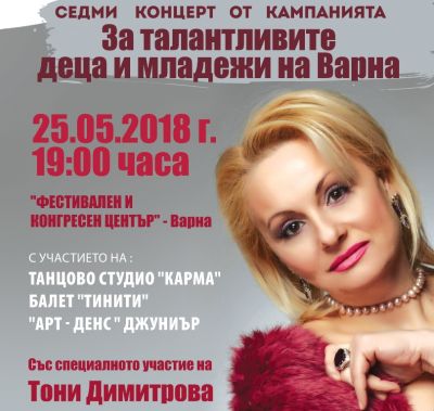 За седма година във Варна ще се проведе специален благотворителен концерт, средствата от които ще бъдат дарени в подкрепа на талантилвите деца на Варна, научи Moreto.net. На 25 май, от 19 часа, в Зала 1 на Фестивален и конгресен център ще излязат: Танцово студио „Карма”, Балет „Тинити” и „Арт-денс" Джуниър. Специален гост на концерта ще бъде Тони Димитрова. Цена на билета: 7 лв.