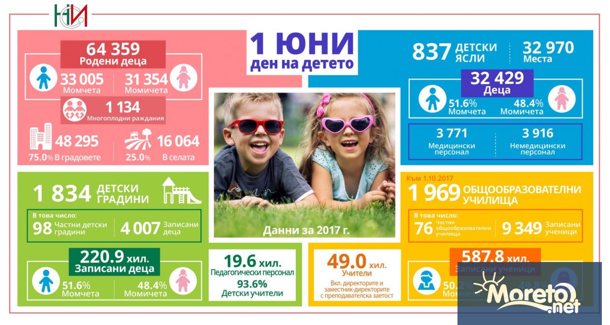 Пред 2017 година в България са родени 64 359 деца, от които 33 005 момчета и 31 354 момичета. Многоплодните раждания са 1 134.