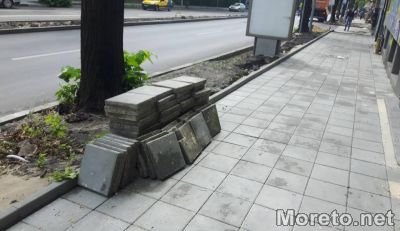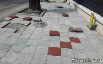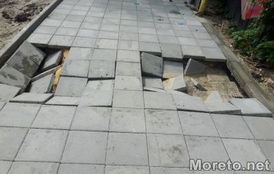 Силният дъжд буквално изкърти плочките от наскоро положената тротоарна настилка край двата обекта. Работа по възстановяване на пораженията ще започне веднага. На практика двата обекта все още не са приети от администрацията и не са платени, обясни Портних.