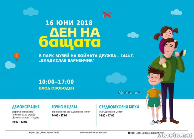 На 16 юни, (събота), от 10.00 до 17.00 ч. с вход свободен в Парк-музей на бойната дружба – 1444 г. „Владислав Варненчик“ ще се проведе Ден на бащата, посветен на специалната връзка между таткото и детето, научи Moreto.net.