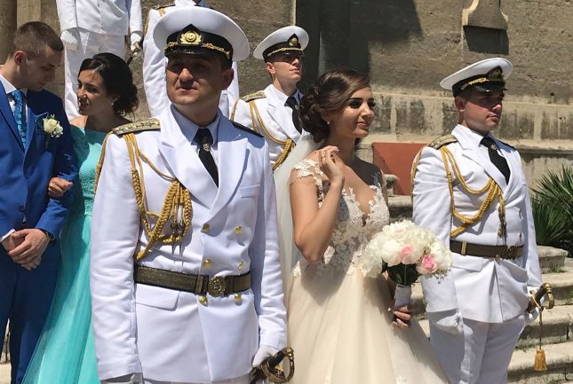 Сватбата на двама морски офицери се превърна в истинска атракция за преминаващите край Катедралния храм „Свето Успение Богородично“ варненци, видя репортер на Moreto.net.