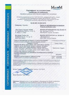 Всички био плодове и зеленчуци на "Био Гардън Терзиев" са сертифицирани от независима компания Маком Сертифициране, а сертификатът може да се провери от всеки.