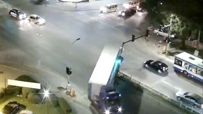 В клип от охранителна камера във Варна се вижда неправилна маневра на камион, който отнася част от светофарната уредба. Видеото, изпратено от читател на Moreto.net, е направенo малко след 22:00 часа в четвъртък (23 август).