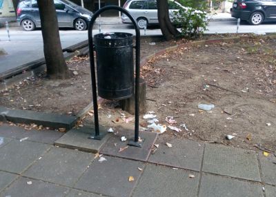 Всички кошчета са в окаяно състояние, без дъна и опасни поради остри ръждиви части. Новопоставените кошчета (оранжевите) са постоянно пълни и явно крайно недостатъчни.