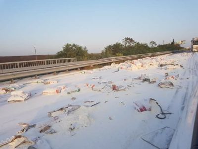 От варненската полиция съобщиха за Moreto.net, че около 06:30 часа, на АМ "Хемус", до отбивката за с. Млада Гвардия, по време на движението на т.а. "ДАФ", от товарната част изпадат два палета пакети с блашно, като брашното се е разпиляло по пътното платно. За почистване на пътния участък се налага платното за движение в посока Варна, в участъка между с. Невша и Провадия, да бъде затворен в интервала 10:30 - 12:00 часа.