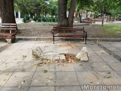 Една от пейките в градинката зад Община Варна, буквално е потрошена, видя репортер на Moreto.net.