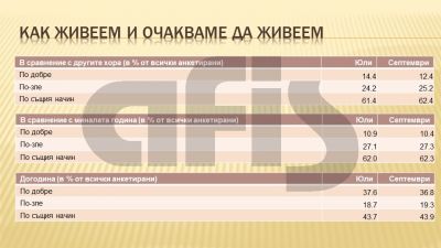 Краят на българското председателство и нетипично горещото политическо лято не останаха без последствия. Оценките и самооценките на българските граждани за заобикалящата ги действителност са се влошили в сравнение с предходните месеци. С два пункта за последния месец е спаднал делът на хората, които преценяват, че живеят по-добре в сравнение с другите, което се съчетава с един пункт нарастване на дела на онези, които смятат, че живеят по-зле. Спада и оптимизмът за бъдещето, без да се променят оценките за живота през миналата година.