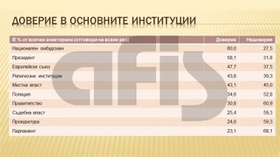 Доверието в институциите продължава да се руши, за първи път недоверието в парламента е на по-високо ниво в сравнение със съдебната власт и прокуратурата, сочат данни на социологическото проучване на агенция АФИС.