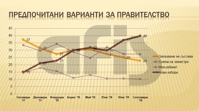 Логично следствие от това е увеличеният ръст на дела на избирателите, които все повече насочват погледа си към варианта „предсрочни избори“ като някаква възможност за промяна. За последните три месеца този дял бележи ръст от 10 пункта и през Септември достига ниво от 40 на сто. Предлаганото „лекарство“ – смяна на министри, макар в началото да предизвика временни позитивни очаквания, сега бележи низходяща тенденция. Може би и заради това, че въпреки шумния спектакъл около трите оставки, не бяха сменени министрите, които хората биха освободили от постовете им, ако зависеше от тях, а именно: Валери Симеонов (46,0%), Цецка Цачева (44,2%) и Румен Порожанов (36,8%). Допълнителен щрих към общата картина внасят и отговорите на въпроса „Нараства или намалява нивото на корупция? Според 53,5% от хората това ниво нараства, а според други 31,4% – остава на същото ниво. Едва 10,1% са на мнение, че корупцията в страната намалява, което не се споделя дори от половината от привържениците на партиите от управляващата коалиция.
