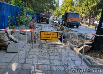 На място има работници и строителни машини, които премахват тротоарните плочи. Ремонтът затруднява пешеходците, за които има обозначителна табела: "Премини на отсрещния тротоар", въпреки пешеходните пътеки.