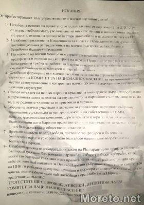 Сред исканията е и саморазпускане на всички партии и връщане на милиардите държавни субсидии. В друга точка се настоява за незабавна промяна на избирателния закон.