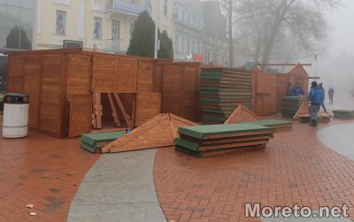 Работници монтират къщичките за коледно-новогодишния базар на площад "Независимост" във Варна, видя репортер на Moreto.net.