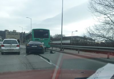 Черен автомобил „Ауди” се е забил в задната част на автобуса, като преди това се е сблъскал със синьо „БМВ”.