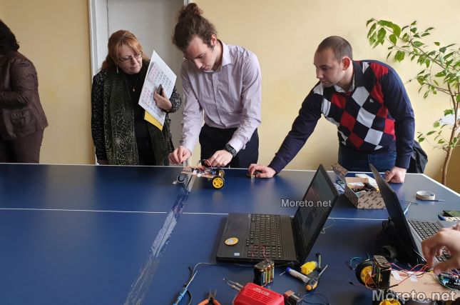 Един от проектите, който предизвика интерес на днешното мероприятие, е количката-робот на Пресиян и Стефан, възпитаници на Професионалната гимназия по електротехника. Техният проект е създаден, за да изпълнява различни команди, като например автоматично да се включва и изключва осветлението вкъщи. Командите ще се изпълняват с помощта на мобилно приложение.