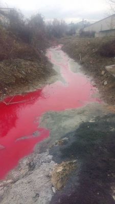На място експертите са открили тръба, от която изтича червена вода, включена в шахта на дъждовната канализация, разположена непосредствено до производствен цех за печат.