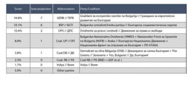 Преизчислени в депутатски места прогнозните резултати изглеждат така: 7 места в Европарламента за ГЕРБ, 6 - за БСП, 2 - за ДПС, 1 - за "Обединени патриоти", 1 - за "Демократична България".