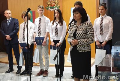Председателят на Народното събрание Цвета Караянчева награди учениците от Математическата гимназия "Д-р Петър Берон" във Варна за спечелените първи места в най-престижния конкурс на НАСА и Националното космическо общество на САЩ за проектиране на космически колонии, предаде репортер на Moreto.net.