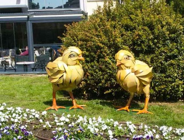 Ефектните украси са допълнени с лалета и нарциси, върбов венец и пиленца.