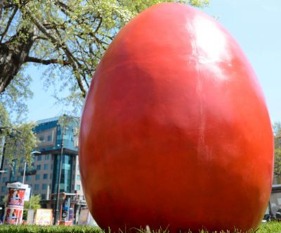 Великденската украса, изработена от полиестерна смола и метал, е дело на младия варненски скулптор Венцислав Марков.