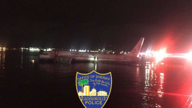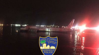 Кацането е станало 21:40 ч. в петък. При изключително лошо време чартърен полет с 143 души на борда не е могъл да кацне на пистата в Джаксънвил и спрял в близката река Сейнт Джонс. Самолетът не е потънал.