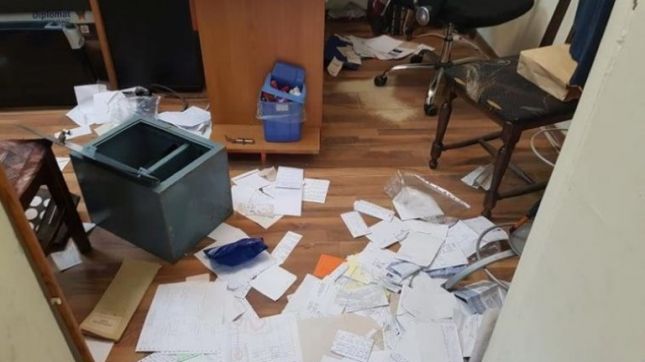 Из двете помещения са разхвърляни документи и папки. Всички шкафове и чекмеджета са изпразнени, а съдържанието им е изсипано на земята.