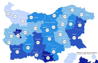 Очакваната продължителност на живота варира от 72.7 години в област Монтана до 76.6 години в областите София (столица) и Кърджали, като общо в осем области тя е над средната за страната.
