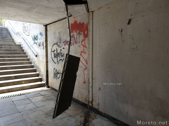 По думите на един от търговците, които има магазин в подлеза, парчето, висящо от тавана, е откъртено от вандали.
