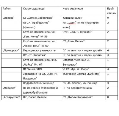 Адресите на 43 секции, разположени на дванадесет места, са променени в сравнение с предходните избори през 2017 г. (посочени са в таблицата), припомня Moreto.net. Причината са ремонтни дейности, които се извършват по различни европейски проекти.