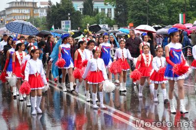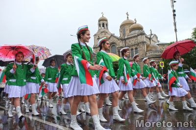 Под неспиращия дъжд варненски ученици изпълниха фолклорна композиция, след което започна шествието, в което участваха 110 блока от варненските детски градини, училища, университети, на образователни, културни, спортни и социални институции и други.
