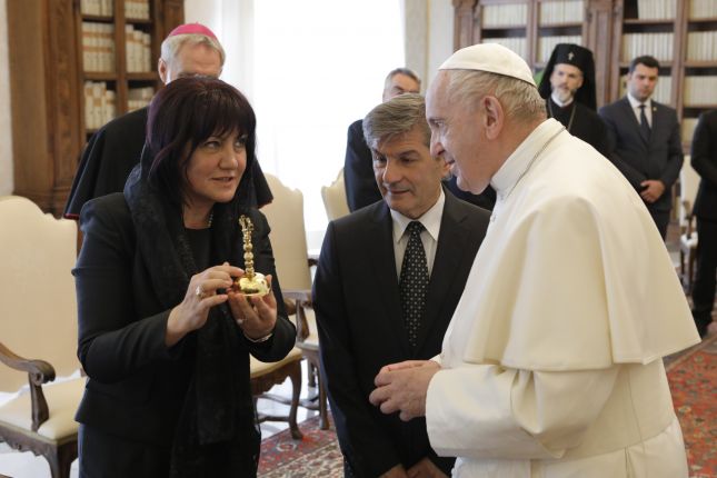 С посланието „Пазете мира, разпространявайте мира“ папа Франциск посрещна във Ватикана българската парламентарна делегация, която е в Рим по повод 24 май. Главата на римокатолическата църква прие на аудиенция в Апостолическия дворец и подари на председателя на Народното събрание Цвета Караянчева метална статуетка с гълъб, който държи маслинова клонка. В основата на статуетката пише „Пазете мира, разпространявайте мира“, съобщават от пресцентъра на Народното събрание