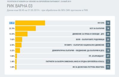 ГЕРБ продължава да води във Варна, при провелите се вчера избори за членове на Европейски парламент, научи Moreto.net. Такива са междинните резултати при обработени 66,98% от протоколите на секционните избирателни комисии. Данните са към 8:45 часа днес. Избирателите са наредили ГЕРБ на първо място с 25 587 гласа, а БСП с 17 706 гласа се нарежда на второ място. Едва 36 души са дали своя вот за партия Възход, което я нарежда на последната позиция.