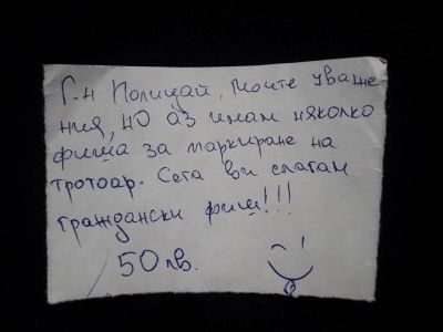 "Г-н полицай, моите уважения, но аз имам няколко фиша за паркиране на тротоар. Сега ви слагам граждански фиш - 50 лв.", гласи написаната бележка, поставена върху предното стъкло на полицейския автомобил.