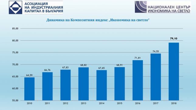 АИКБ изчислява Композитния индекс „Икономика на светло“ от 2010 г. До 2013 г. той нараства плавно, като единственият спад от 1,2 пункта отбелязва през 2014 г. От 2015 г. продължава тенденцията на неговия ръст.