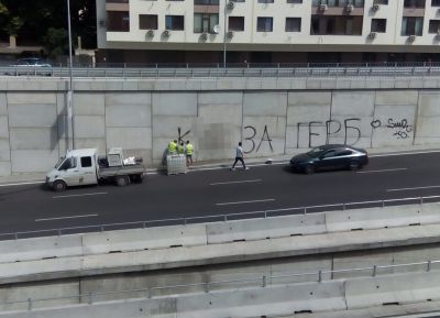 Около 10.30 часа общински служители са започнали премахването на надписите с вода и препрати. Нецензурният израз е изписан на подпорните стени на бул."Васил Левски" в района на кръговото с бул."Сливница".
