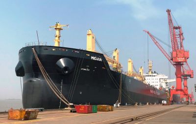 В китайската корабостроителница Jiangsu New Yangzi Shipbuilding Co., Ltd. спуснаха на вода втори пореден 45 000-тонен моторен кораб за превоз на насипни товари, поръчан от Параходство БМФ АД, научи Moreto.net. Плавателният съд е от проекта Bluetech 45 - развитие на успешния проект Bluetech 42, от който компанията вече оперира три кораба: „Руен“, „Рила“ и „Рожен“. Вторият 45 000-тонен кораб ще носи името „Миджур“ и строителството му се наблюдава от класификационната организация DNV-GL.