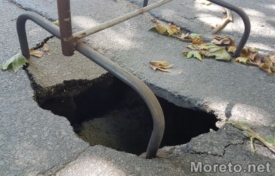 Огромна дупка се е отворила заради пропадане на асфалта. В отворилата се дупка в асфалта се вижда пропадане на земната маса, което е над 60 сантиметра.