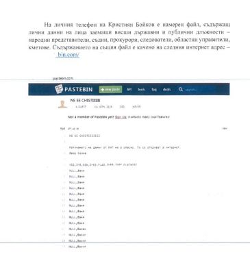 Материалите, разпратени от прокуратурата, представляват стоп кадри от записите на камерите от офиса на "Тад груп" и изписани субтитри на разговори. Друга част от доказателствата са отново снимки от компютъра и телефона на Кристиян Бойков, например в телефона е показан като история затворен чат с "Бивол" - нещо, за което вчера прокурор Стайкова беше категорична, въпреки че Атанас Чобанов категорично отрече да се е познавал в хакера.