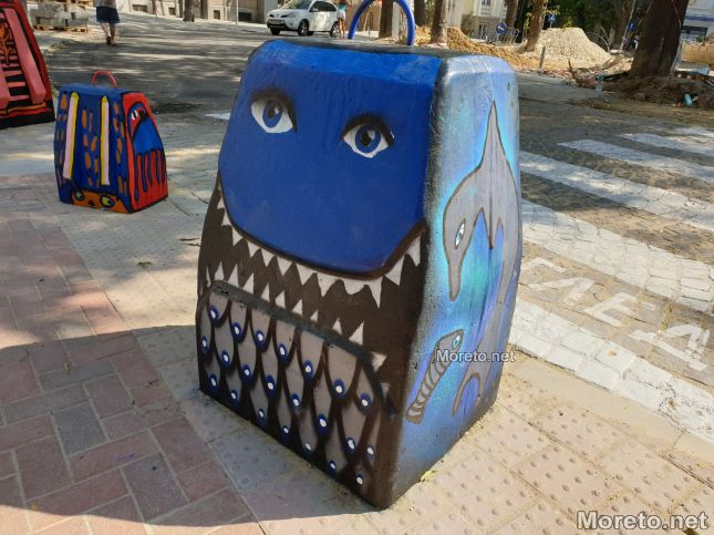 Монументите на акула, котки, риби, жирафи и др. фигури имат функцията на антипаркинг елементи в края на новата пешеходна зона и са дело на малки художници към кръжока "Азбука на въображението" под ръководството на стрийтартиста Виктория Георгиева (Mouse).