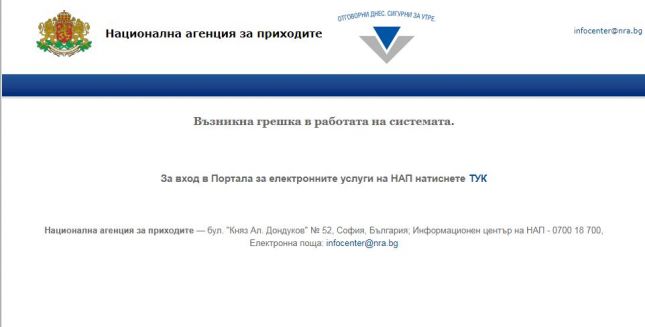 Сайтът на НАП не работи, видя Moreto.net При влизане в сайта на Националната агенция за приходите излиза съобщение за възникнала грешка в работата на системата.