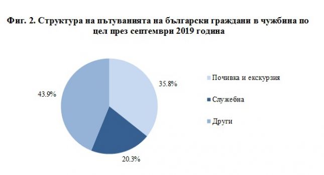 В сравнение със септември 2018 г. e регистрирано увеличение по всички наблюдавани цели: „почивка и екскурзия“ - с 5.8%, „други“ - с 1.9%, и „служебна“ - с 1.5%. Най-голям относителен дял от общия брой пътувания на български граждани в чужбина през септември 2019 г. формират пътуванията с други цели (гостуване, обучение, посещение на културни и спортни мероприятия) - 43.9%, следвани от тези с цел почивка и екскурзия - 35.8%, и със служебна цел - 20.3% .