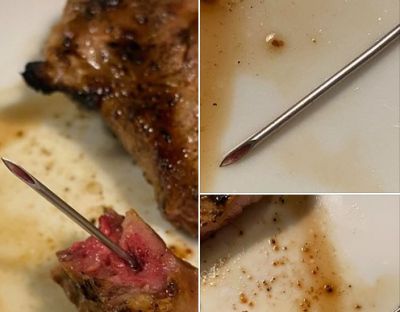 Иглата е използвана, за да се н апълнин месото с вода. Дали търговският обект го е правил или борсата (кланица), от която се взима не е ясно, но навярно това е причината за иглата в месото.