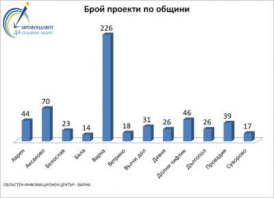 За периода най-много проекти по европейски програми са осъществени на територията на Община Варна - общо 226. Следват Аксаково със 70 проекта и Долни чифлик с 46. Най-малко бенефициенти има в Бяла - 14.