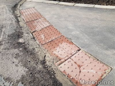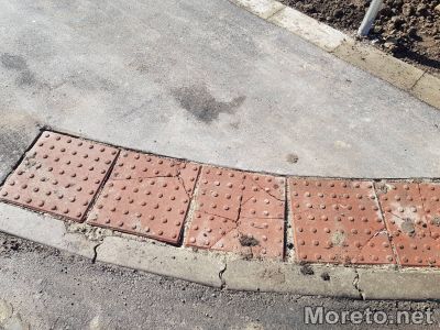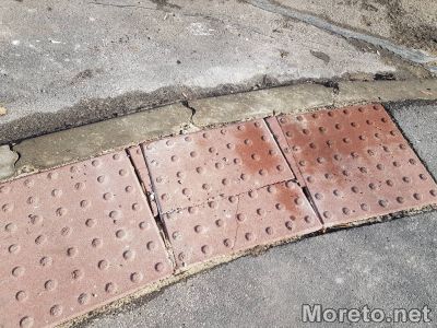 Тактилните плочки (на снимките оребрени и оцветени в червеникаво), прясно поставени в началото и в края на всеки тротоар, които помагат на хората с нарушено зрение, на почти всички места са начупени. Това вероятно и няма голямо значение, защото на практика по тротоарите е пълно с автомобили, което ги прави непроходими за хора с нарушено зрение, хора, приковани в инвалидна количка, и, разбира се, за майки с колички и за детски велосипеди.