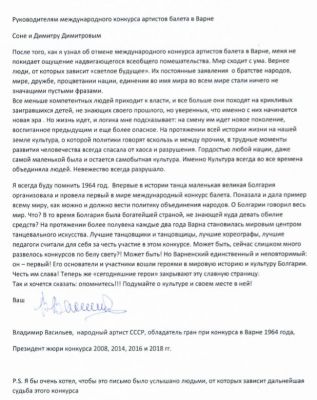 Междувременно във фондацията е пристигнало писмо от Владимир Василев – носител на единствената в историята на Варненския конкурс присъдена Голяма награда и Председател на журито на конкурса във Варна през 2008, 2014, 2016 и 2018 г.