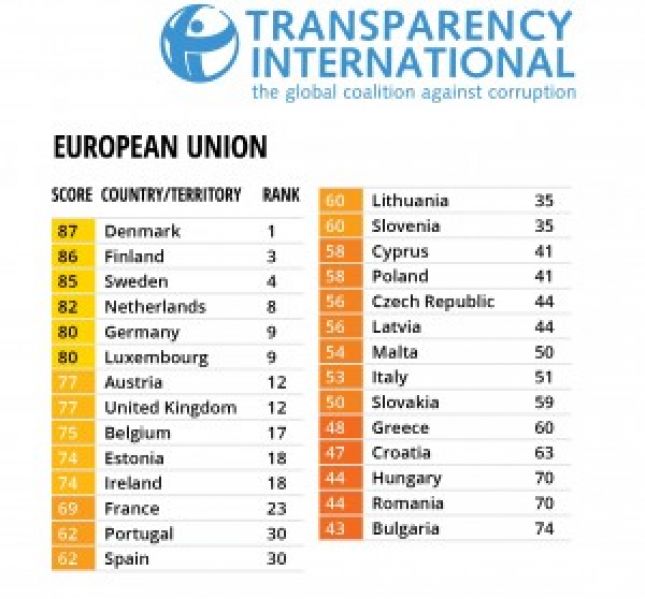 Резултатите от изследването показват, че скандинавските държави отново заемат водещите позиции в регионалната класация. Първо място в европейската класация заема Дания, следвана от Финландия, Швеция и Швейцария. Оценките на тези страни свидетелстват за ефективно прилагани правила, регулиращи поведението на политиците и на държавните служители, както и за наличието на стабилни системи, осигуряващи прозрачност и отчетност при функционирането на институциите.