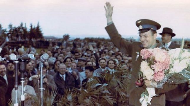 Гагарин в България през 1961 г. Снимка: архив на БНР. Посещава България за втори път през 1966 г. заедно със съпругата си Валя.