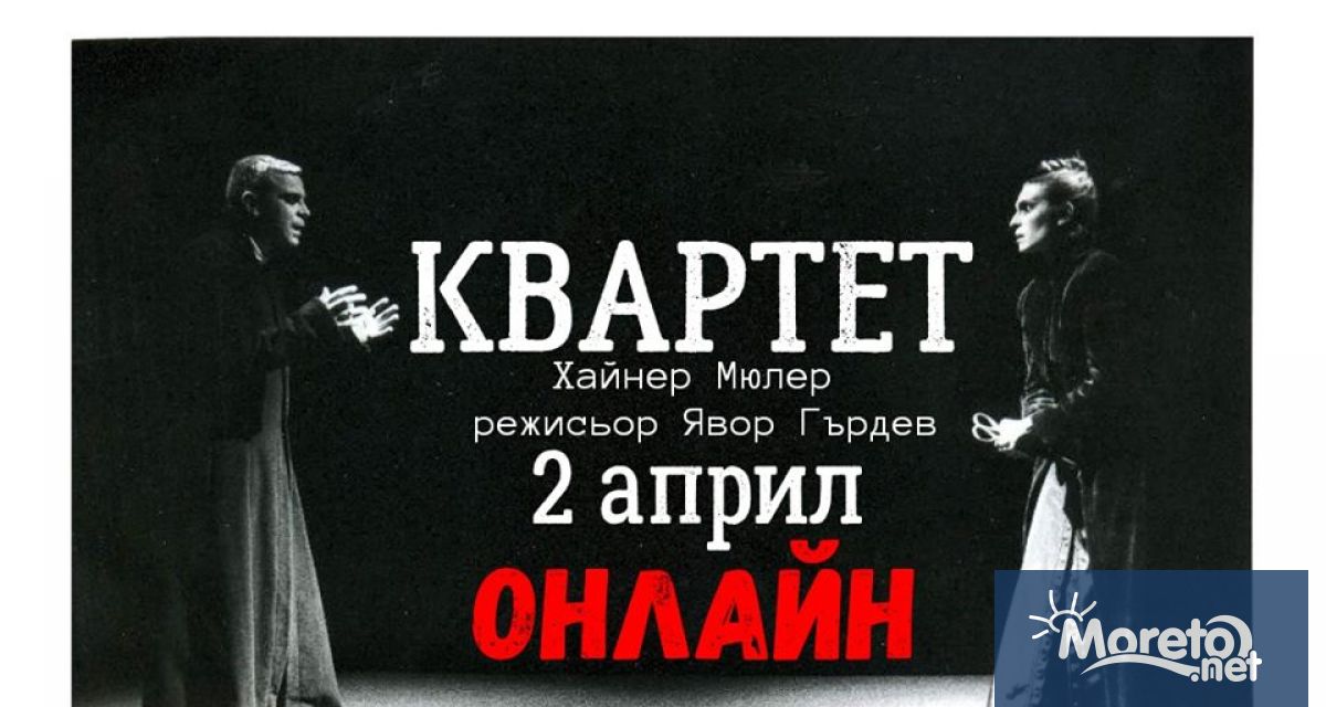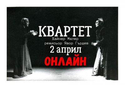 „Квартет" с текст от Хайнер Мюлер с литературна адаптация, сценична версия и постановка на режисьора Явор Гърдев ще бъде излъчен в 19 часа, в YouTube канала на "Сфумато"