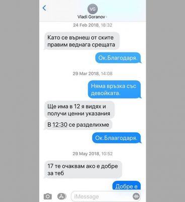 Съобщенията между двамата са с дати от 24 февруари 2018 г., 29 март 2018 г. и 29 май 2018 г. Комуникацията продължава на 15 януари и на 16 януари тази година.
